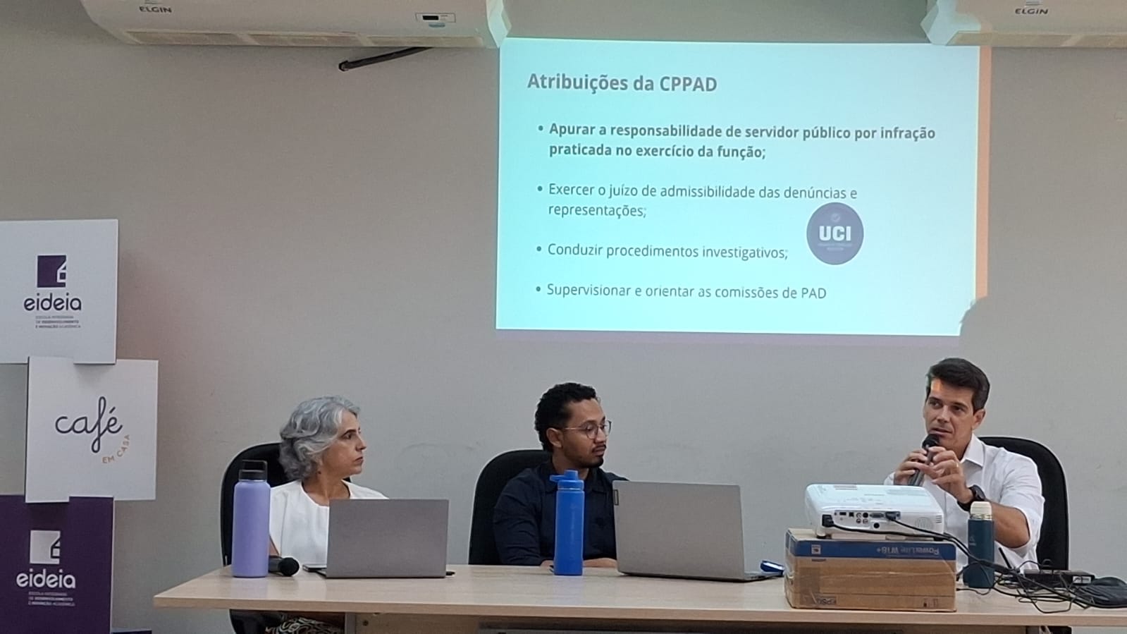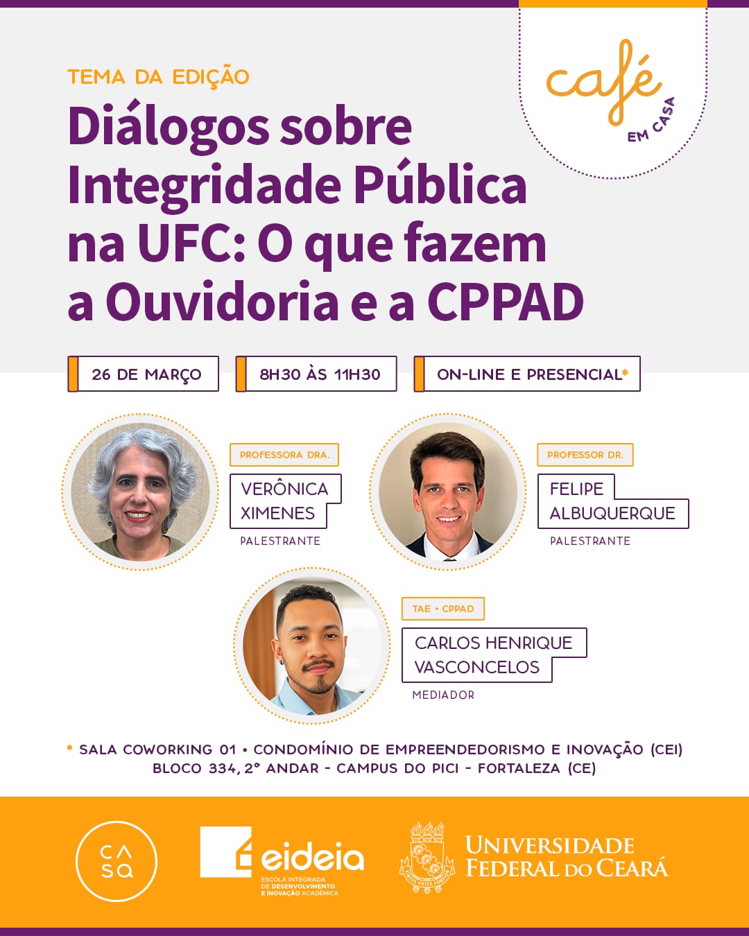 A CPPAD foi convidada pela Escola Integrada de Desenvolvimento e Inovação Acadêmica – EIDEIA para participar da segunda atividade do Café em CASa no ano de 2026. Ocorrido no dia 26 de março, no Condomínio de Empreendedorismo e Inovação, o evento contou com a presença da professora Drª Verônica Morais Ximenes (Ouvidora Geral da UFC), do professor Dr. Felipe Braga Albuquerque (Presidente da Comissão Permanente de Processo Administrativo Disciplinar – CPPAD) e do TAE Carlos Henrique de Sousa Vasconcelos (Secretário da CPPAD), para a palestra “Diálogos sobre Integridade Pública na UFC: O que fazem a Ouvidoria e a CPPAD”.